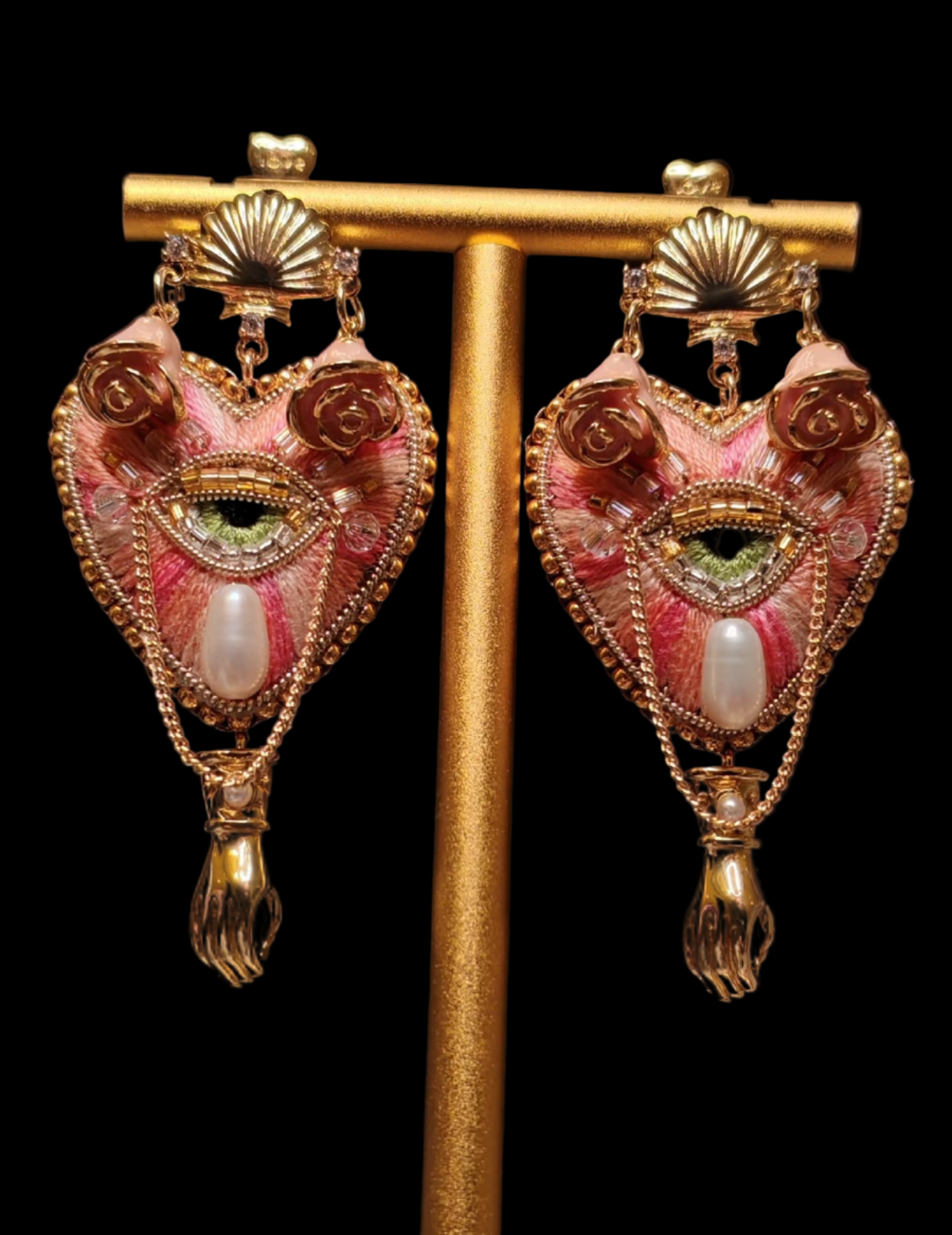 An exquisitely hand-stitched heart, artfully combined with Indian metallic thread, Swarovski crystals, and natural pearls. More than an accessory, it's a tangible piece of art.