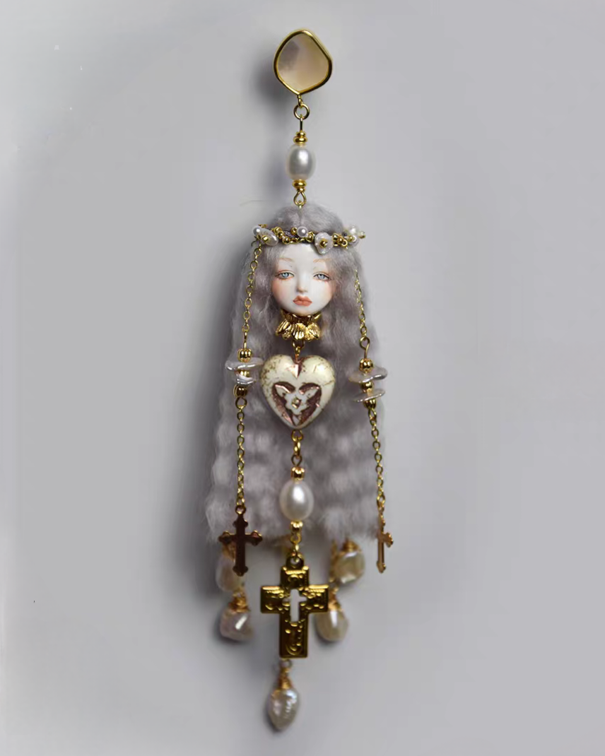 - Hair: Composed of wool felt, hand-strung glass beads, natural pearls, and other metal fittings.